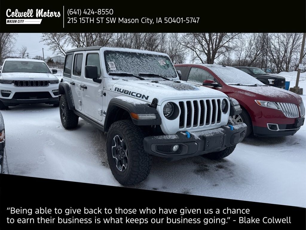 FREE VEHICLE HISTORY REPORT, BACK UP CAMERA, GREAT SAFETY FEATURES, ALLOY WHEELS, GREAT CONDITION INSIDE AND OUT, FULLY SERVICE AND DETAILED, NON SMOKER, 4WD, LEATHER INTERIOR, COLWELL COMMITMENT!, PLUG IN HYBRID 4XE, ABS brakes, Black 3-Piece Hard Top, Compass, Electronic Stability Control, Freedom Panel Storage Bag, Front dual zone A/C, Heated door mirrors, Illuminated entry, Leather Trimmed Bucket Seats, Leather Wrapped Park Brake Handle, Leather Wrapped Shift Knob, Low tire pressure warning, Navigation System, ParkView Rear Back-Up Camera, Passenger door bin, Premium Door Trim Panel, Premium Wrapped I/P Bezels, Quick Order Package 29V Rubicon, Rear Window Defroster, Rear Window Wiper/Washer, Remote keyless entry, Traction control, Wheels: 17" x 7.5" Machined w/Black Pockets.